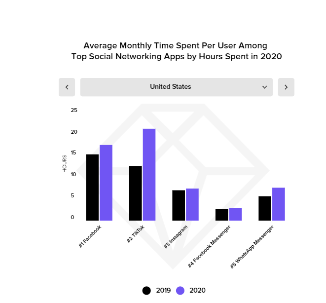 Thời gian sử dụng sẽ cho các thương hiệu biết phạm vi tiếp cận và mức độ tương tác của các ứng dụng. Nhìn chung, thời gian trung bình mà mỗi người dùng dành cho hầu hết các ứng dụng mạng xã hội đã tăng lên ở mọi thị trường. TikTok đứng thứ 5 về lượng thời gian sử dụng và thời gian trung bình hàng tháng mà người dùng dành ra cho các ứng dụng mạng xã hội, tăng nhanh hơn hầu hết các ứng dụng khác trong bảng khảo sát. Xét riêng tại thị trường Mỹ, 70% người dùng dành nhiều thời gian cho TikTok hơn các ứng dụng khác, trong khi tại Anh là 80% – vượt qua Facebook. TikTok đang trên đà đạt được 1,2 tỷ người dùng tích cực vào năm 2021.